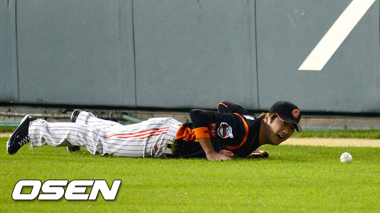 9일 오후 서울 잠실구장에서 열린 2012 팔도 프로야구 준플레이오프 2차전 두산 베어스와 롯데 자이언츠의 경기, 1회말 롯데 문규현이 두산 이종욱의 파울타구를 잡으려 몸을 날렸지만 아쉽게 실패한뒤 아쉬운 표정을 짓고 있다.