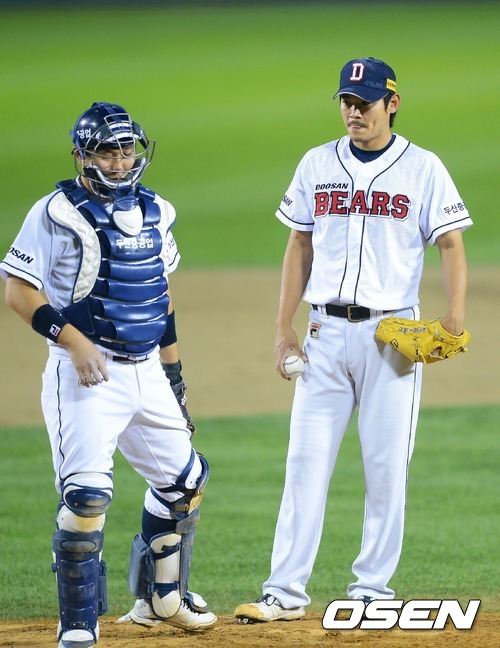 5회초 2사 양의지 포수가 타임을 요청한뒤 노경은 투수와 이야기를 나누고 있다.