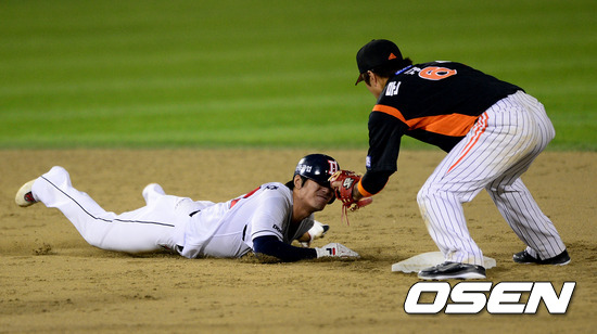 9일 오후 서울 잠실구장에서 열린 2012 팔도 프로야구 준플레이오프 2차전 두산 베어스와 롯데 자이언츠의 경기, 5회말 2사 1루 두산 양의지 타석에 김재호가 2루 도루에 성공했지만 오버런으로 2루로 귀루하다 롯데 문규현에 태그아웃당하고 있다.
