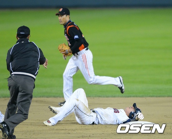 5회말 2사 1루 이종욱 타석때 1루주자 김재호 롯데 유먼 투수의 와일드 피칭때 2루 도루에 성공하였으나 오버런 2루에 귀루하며 태그아웃 처리되고 있다.