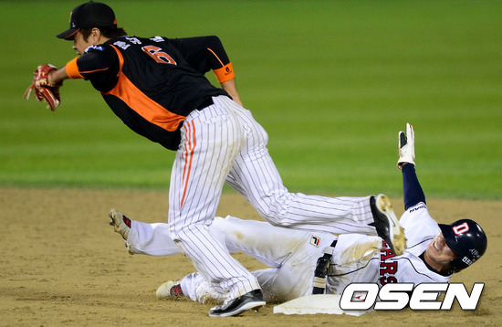 9일 오후 서울 잠실구장에서 열린 2012 팔도 프로야구 준플레이오프 2차전 두산 베어스와 롯데 자이언츠의 경기, 5회말 2사 1루 두산 양의지 타석에 김재호가 2루 도루에 성공했지만 오버런으로 2루로 귀루하다 롯데 문규현에 태그아웃당하고 있다.