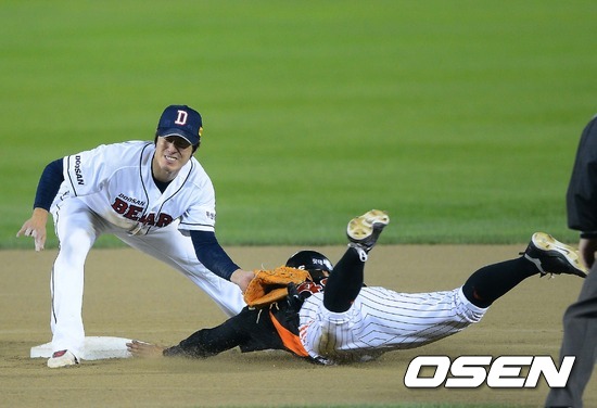 6회초 2사 1루 박종윤 타석때 1루 주자 홍성흔 2루 도루에 성공하고 있다.