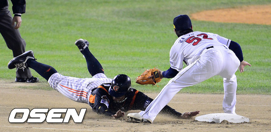 9일 오후 서울 잠실구장에서 열린 2012 팔도 프로야구 준플레이오프 2차전 두산 베어스와 롯데 자이언츠의 경기, 6회초 2사 1루 롯데 박종윤 타석때 1루 주자 롯데 홍성흔이 2루 도루를 성공하고 있다.