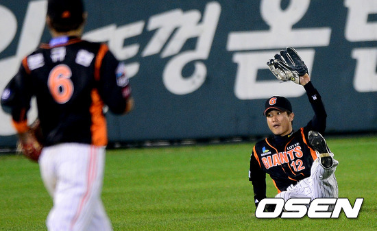 9일 오후 서울 잠실구장에서 열린 2012 팔도 프로야구 준플레이오프 2차전 두산 베어스와 롯데 자이언츠의 경기, 6회말 1사에서 롯데 김주찬이 두산 오재원의 안타성 타구를 잡아내고 있다.