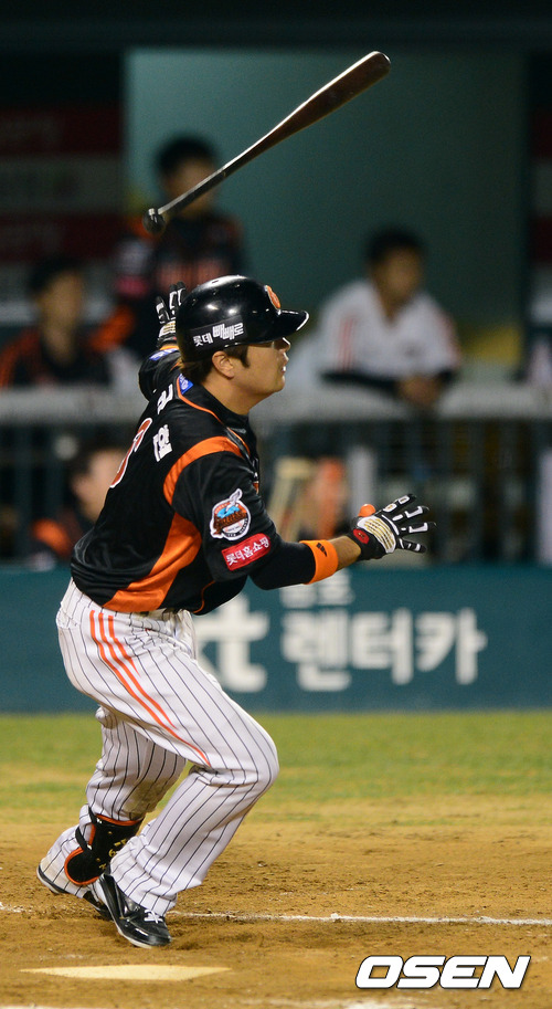9일 오후 서울 잠실구장에서 열린 2012 팔도 프로야구 준플레이오프 2차전 두산 베어스와 롯데 자이언츠의 경기, 7회초 1사 1,2루에서 롯데 문규현이 동점 적시타를 날리고 타구를 바라보고 있다.