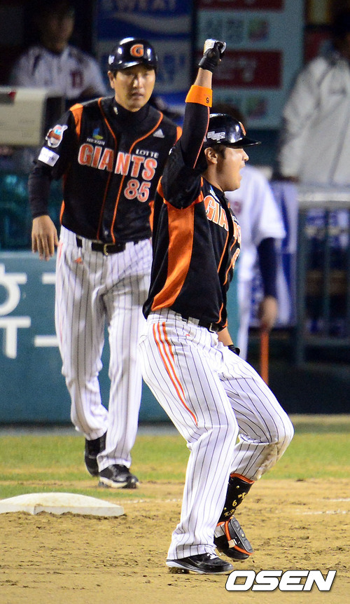 9일 오후 서울 잠실구장에서 열린 2012 팔도 프로야구 준플레이오프 2차전 두산 베어스와 롯데 자이언츠의 경기, 7회초 1사 1,2루 롯데 문규현이 1타점 적시타를 때린뒤 기뻐하고 있다.