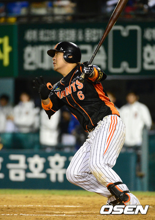 9일 오후 서울 잠실구장에서 열린 2012 팔도 프로야구 준플레이오프 2차전 두산 베어스와 롯데 자이언츠의 경기, 7회초 1사 1,2루에서 롯데 문규현이 동점 적시타를 치고 있다.