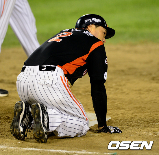9일 오후 서울 잠실구장에서 열린 2012 팔도 프로야구 준플레이오프 2차전 두산 베어스와 롯데 자이언츠의 경기, 7회초 1사만루에서 롯데 조성환이 내야땅볼로 병살당하며 역전에 실패하자 아쉬워하고 있다.