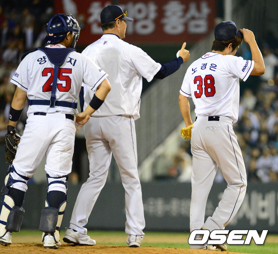 9일 오후 서울 잠실구장에서 열린 2012 팔도 프로야구 준플레이오프 2차전 두산 베어스와 롯데 자이언츠의 경기, 7회초 1사 만루 롯데 조성환 타석떄 두산 노경은이 마운드를 내려가고 있다. 노경은은 6⅓이닝 1실점을 기록했다.