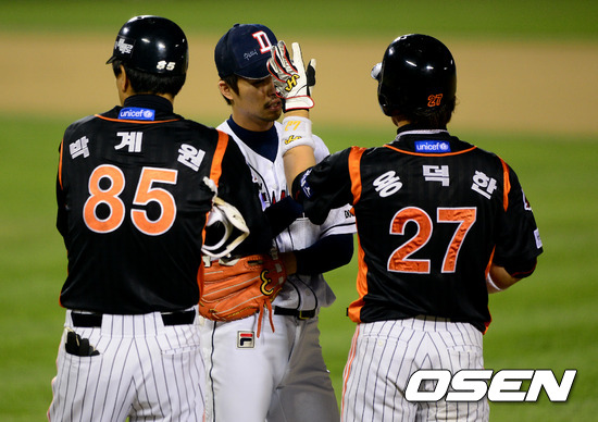 9일 오후 서울 잠실구장에서 열린 2012 팔도 프로야구 준플레이오프 2차전 두산 베어스와 롯데 자이언츠의 경기, 7회초 1사 1루에서 롯데 용덕한이 중전안타를 날리고 두산 1루수 오재원과 이야기를 나누고 있다.