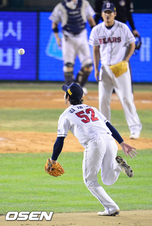 9일 오후 서울 잠실구장에서 열린 2012 팔도 프로야구 준플레이오프 2차전 두산 베어스와 롯데 자이언츠의 경기, 7회초 1사 1,2루 두산 김재호가 롯데 김주찬의 내야 땅볼 타구를 잡으려다 에러를 범하고 있다.