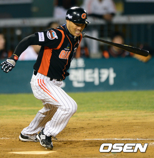 9일 오후 서울 잠실구장에서 열린 2012 팔도 프로야구 준플레이오프 2차전 두산 베어스와 롯데 자이언츠의 경기, 7회초 1사만루에서 롯데 조성환이 내야땅볼을 날리고 1루로 향하고 있다. 조성환은 병살로 역전에 실패.