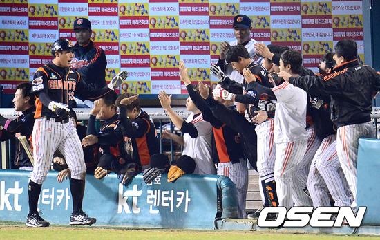 9일 오후 서울 잠실구장에서 열린 2012 팔도 프로야구 준플레이오프 2차전 두산 베어스와 롯데 자이언츠의 경기, 7회초 1사 1,2루 롯데 문규현의 안타때 홈을 밟은 황재균이 더그아웃에서 동료들과 기뻐하고 있다.