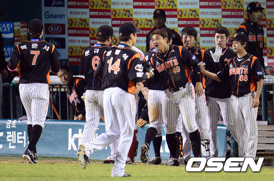 9일 오후 서울 잠실구장에서 열린 2012 팔도 프로야구 준플레이오프 2차전 두산 베어스와 롯데 자이언츠의 경기, 8회말 롯데 홍성흔이 수비를 마치고 더그아웃으로 들어오는 선수들을 맞이하고 있다.