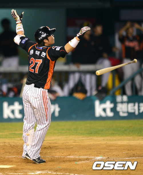 9일 오후 서울 잠실구장에서 열린 2012 팔도 프로야구 준플레이오프 2차전 두산 베어스와 롯데 자이언츠의 경기, 9회초 1사에서 롯데 용덕한이 역전 솔로포를 날리고 타구를 바라보고 있다.