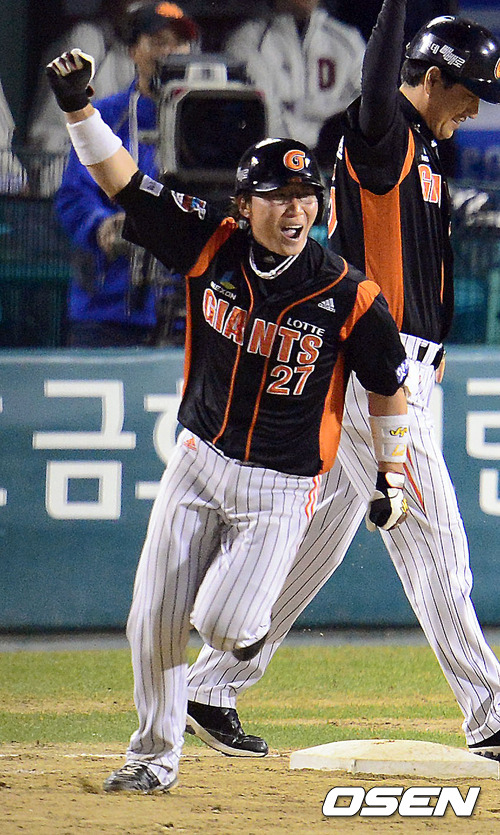 9일 오후 서울 잠실구장에서 열린 2012 팔도 프로야구 준플레이오프 2차전 두산 베어스와 롯데 자이언츠의 경기, 9회초 1사 롯데 용덕한이 역전 솔로 홈런을 때리고 베이스를 돌며 환호하고 있다.