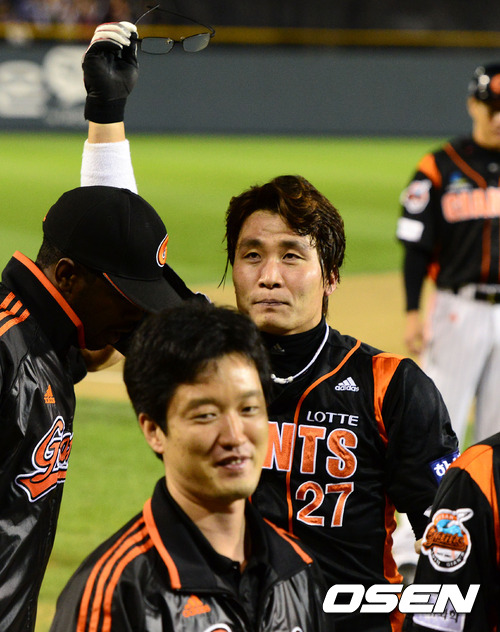 9일 오후 서울 잠실구장에서 열린 2012 팔도 프로야구 준플레이오프 2차전 두산 베어스와 롯데 자이언츠의 경기, 9회초 1사 용덕한이 좌월 역전 솔로홈런을 더그아웃에서 관중석을 향해 인사를 하고 있다.