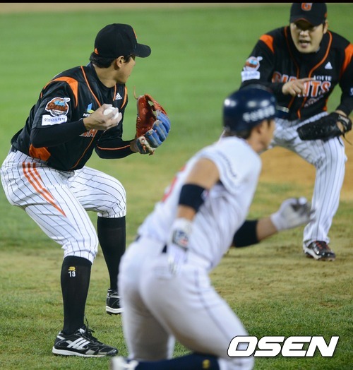 9회말 무사 1루 윤석민 보내기 번트때 롯데 황재균 3루수가 포구하며 2루에 송구 병살아웃처리 시키고 있다.
