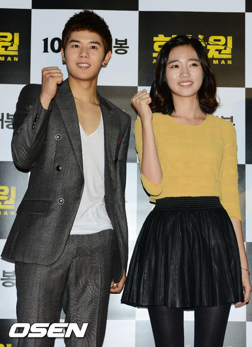 9일 오후 서울 코엑스 메가박스에서 영화 '회사원' VIP 시사회가 열릴 예정인가운데 배우 김동준과 한보배가 포토월에서 포즈를 취하고 있다.