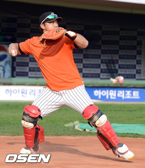 2012 팔도 프로야구 준플레이오프 3차전을 하루 앞둔 10일 오후 부산 사직구장에서 홍성흔이 포수 훈련을 하고 있다.