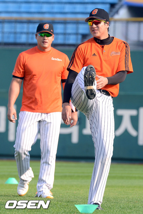 2012 팔도 프로야구 준플레이오프 3차전을 하루 앞둔 10일 오후 부산 사직구장에서 롯데 황재균이 스트레칭을 하고 있다.