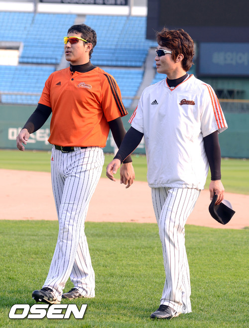 2012 팔도 프로야구 준플레이오프 3차전을 하루 앞둔 10일 오후 부산 사직구장에서 롯데 황재균과 용덕한이 운동장을 빠져나가고 있다.