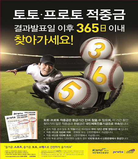 '스포츠토토 참가자 여러분. 환불금 및 적중상금은 365일 이내에 꼭 찾아가세요.'