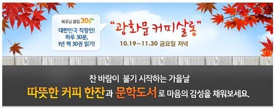 쌀쌀한 바람에 따뜻한 커피 한 잔이 생각나는 가을이다. 때맞춰 교보문고(대표 허정도, www.kyobobook.co.kr) 독서경영연구소는 광화문점에서 독서와 커피를 동시에 즐길 수 있는 문화강좌 '광화문 커피살롱'을 운영하기로 했다.