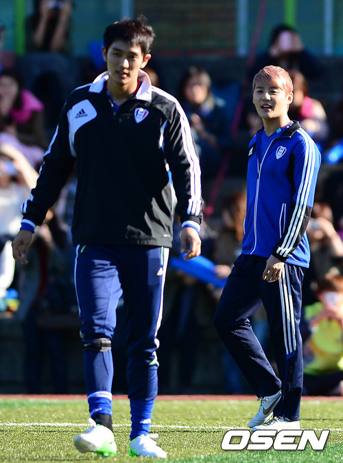 [OSEN = 백승철 기자] 11일 오후 서울 노원구 삼육대학교에서 열리는 연예인 축구단 FC MEN과 삼육대학교 학생들의 자선경기에 앞서 김준수와 임슬옹이 연습시간을 갖고 있다.