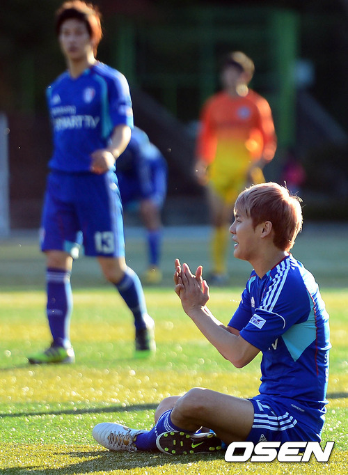 [OSEN = 백승철 기자] 11일 오후 서울 노원구 삼육대학교에서 열린 연예인 축구단 FC MEN과 삼육대학교 학생들의 자선경기에서 동료가 패널티킥을 얻어내자 김준수가 박수를 치고 있다.
