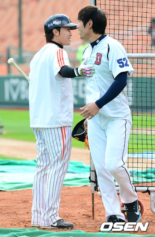 11일 오후 부산 사직구장에서 열린 2012 팔도 프로야구 준플레이오프 3차전 두산 베어스와 롯데 자이언츠의 경기, 경기에 앞서 롯데 용덕한과 두산 김재호가 인사를 나누고 있다.
