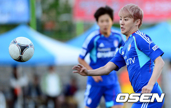 [OSEN = 백승철 기자] 11일 오후 서울 노원구 삼육대학교에서 열린 연예인 축구단 FC MEN과 삼육대학교 학생들의 자선경기에서 김준수가 볼을 다루고 있다.