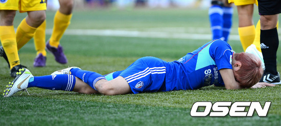 [OSEN = 백승철 기자] 11일 오후 서울 노원구 삼육대학교에서 열린 연예인 축구단 FC MEN과 삼육대학교 학생들의 자선경기에서 삼육대 수비와 충돌한 김준수가 잔디 위에 누워 고통을 호소하고 있다.