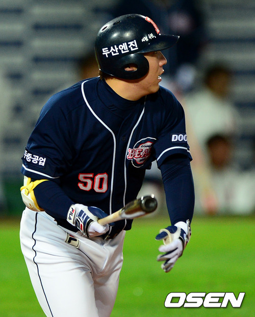 11일 오후 부산 사직구장에서 열린 2012 팔도 프로야구 준플레이오프 3차전 두산 베어스와 롯데 자이언츠의 경기, 1회초 1사 3루에서 두산 김현수가 선제 1타점 적시타를 날리고 타구를 바라보고 있다.