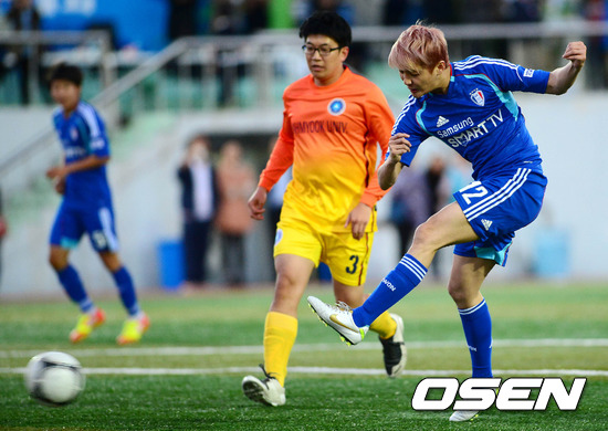[OSEN = 백승철 기자] 11일 오후 서울 노원구 삼육대학교에서 열린 연예인 축구단 FC MEN과 삼육대학교 학생들의 자선경기에서 김준수가 슈팅을 하고 있다.