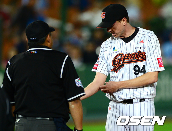 11일 오후 부산 사직구장에서 열린 2012 팔도 프로야구 준플레이오프 3차전 두산 베어스와 롯데 자이언츠의 경기, 1회초 2사 1루에서 롯데 사도스키가 김풍기 구심을 불러 오른쪽 팔뚝 통증을 호소하고 있다.