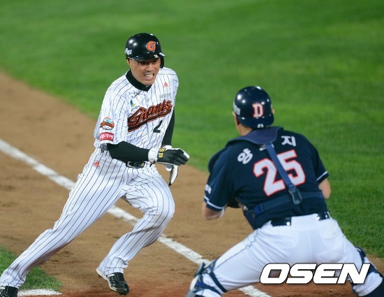 11일 오후 부산 사직구장에서 열린 2012 팔도프로야구 준플레이오프 3차전 두산 베어스와 롯데 자이언츠 경기, 1회말 1사 만루 박종윤 우익수 플라이때 3루 주자 조성환 태그업 홈까지 뛰어들었으나 태그아웃 처리되고 있다.