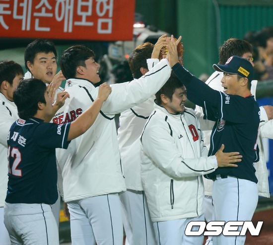 11일 오후 부산 사직구장에서 열린 2012 팔도프로야구 준플레이오프 3차전 두산 베어스와 롯데 자이언츠 경기, 1회말 1사 만루상황에서 호수비로 위기상황을 넘긴 두산 임재철이 공수교대때 동료들로 부터 축하를 받고 있다.