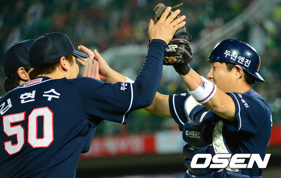 11일 오후 부산 사직구장에서 열린 2012 팔도 프로야구 준플레이오프 3차전 두산 베어스와 롯데 자이언츠의 경기, 1회말 1사 만루 롯데 박종윤의 외야플라이때 두산 양의지가 홈으로 쇄도한 3루주자 조성환을 태그아웃 처리하고 동료들과 환호하고 있다.