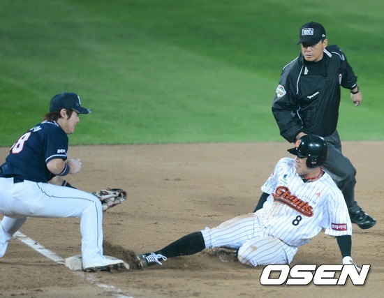 11일 오후 부산 사직구장에서 열린 2012 팔도프로야구 준플레이오프 3차전 두산 베어스와 롯데 자이언츠 경기, 2회말 2사 1루 문규현 우중간안타때 1루 주자 전준우 3루까지 뛰어 세이프 되고 있다.