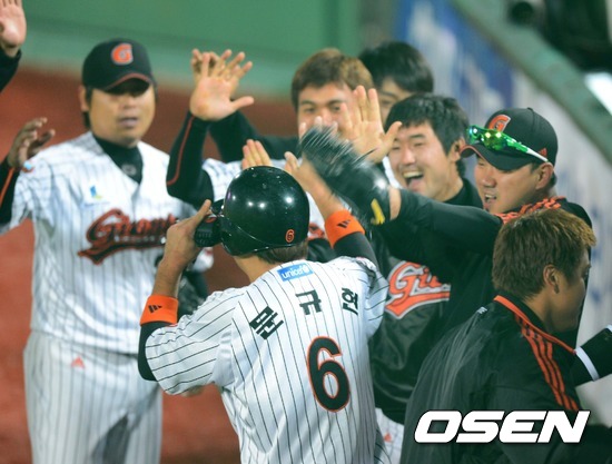 11일 오후 부산 사직구장에서 열린 2012 팔도프로야구 준플레이오프 3차전 두산 베어스와 롯데 자이언츠 경기, 2회말 2사 2루 김주찬 적시타때 2루 주자 문규현 득점을 올리고 덕아웃 동료의 환영을 받고 있다.
