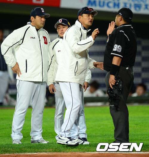 11일 오후 부산 사직구장에서 열린 2012 팔도 프로야구 준플레이오프 3차전 두산 베어스와 롯데 자이언츠의 경기, 2회말 2사 1,3루에서 두산 이용찬이 보크를 범하자 김진욱 감독이 그라운드로 나와 김풍기 구심에게 불만을 나타내고 있다.