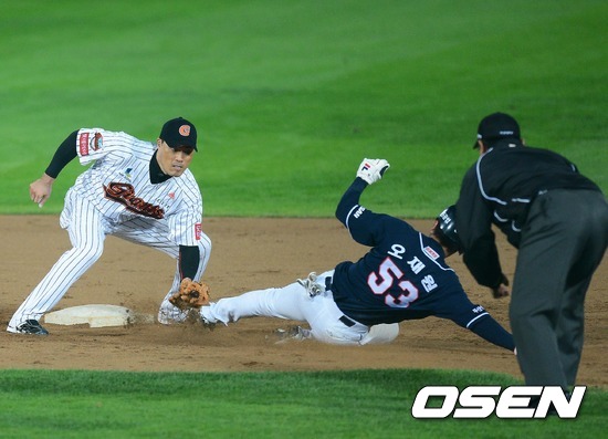 11일 오후 부산 사직구장에서 열린 2012 팔도프로야구 준플레이오프 3차전 두산 베어스와 롯데 자이언츠 경기, 3회초 2사 1루 이원석 타석때 1루 주자 오재원 2루 도루를 하였으나 조성환 2루수에게 태그아웃 처리되고 있다.