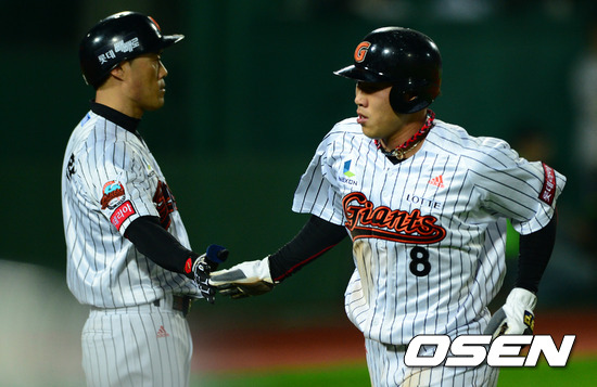 11일 오후 부산 사직구장에서 열린 2012 팔도 프로야구 준플레이오프 3차전 두산 베어스와 롯데 자이언츠의 경기, 2회말 2사 1,3루에서 롯데 전준우가 두산 이용찬의 보크로 홈을 밟고 조성환과 하이파이브를 하고 있다.