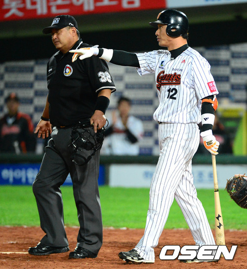 11일 오후 부산 사직구장에서 열린 2012 팔도 프로야구 준플레이오프 3차전 두산 베어스와 롯데 자이언츠의 경기, 2회말 2사 1,3루 롯데 김주찬이 두산 이용찬이 보크가 아니냐며 어필하고 있다.