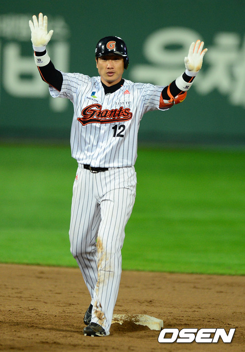 11일 오후 부산 사직구장에서 열린 2012 팔도 프로야구 준플레이오프 3차전 두산 베어스와 롯데 자이언츠의 경기, 2회말 2사 2루에서 롯데 김주찬이 1타점 적시 2루타를 날리고 기뻐하고 있다.