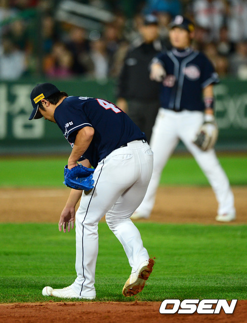 11일 오후 부산 사직구장에서 열린 2012 팔도 프로야구 준플레이오프 3차전 두산 베어스와 롯데 자이언츠의 경기, 2회말 2사 21,3루에서 두산 이용찬이 볼을 흘리며 보크를 범하고 있다.