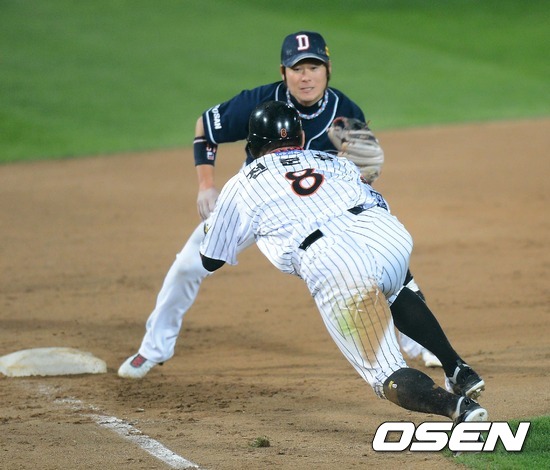 11일 오후 부산 사직구장에서 열린 2012 팔도프로야구 준플레이오프 3차전 두산 베어스와 롯데 자이언츠 경기, 4회말 1사 3루 용덕한 스퀴즈번트 실패때 3루주자 전준우 귀루하였으나 태그아웃 되고 있다.