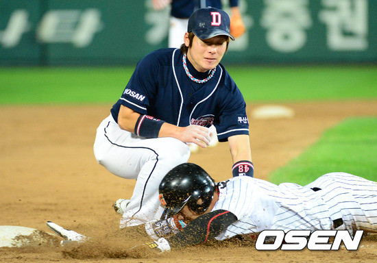 11일 오후 부산 사직구장에서 열린 2012 팔도 프로야구 준플레이오프 3차전 두산 베어스와 롯데 자이언츠의 경기, 4회말 1사 3루 롯데 용덕한 타석때 3루주자 전준우가 두산 양의지의 송구를 받은 이원석에게 태그아웃되고 있다.
