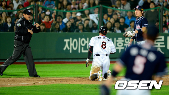 11일 오후 부산 사직구장에서 열린 2012 팔도 프로야구 준플레이오프 3차전 두산 베어스와 롯데 자이언츠의 경기, 4회말 1사 3루에서 롯데 용덕한이 스퀴즈 작전에 실패하자 3루주자 전준우가 귀루하다 태그아웃당하고 있다.